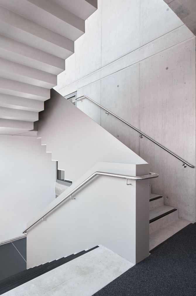 Die Gebäudestruktur vom Bestand wird übernommen und zeitgemäß fortentwickelt: an die beiden vorhanden, einfachen und durch einen Glasbau miteinander verbunden Gebäudekuben wird ein weiterer Kubus über einen Glasverbindungsgang angeschlossen. Auch dieser ist durch ein außen ablesbares Stützen-Träger-System sowie großformatige Fensteröffnungen gekennzeichnet. Durch die Fassade aus Sichtmauerwerk und Sichtbeton wird der reduzierte Duktus des Bestandsgebäudes aufgegriffen und zeitgemäß interpretiert.
